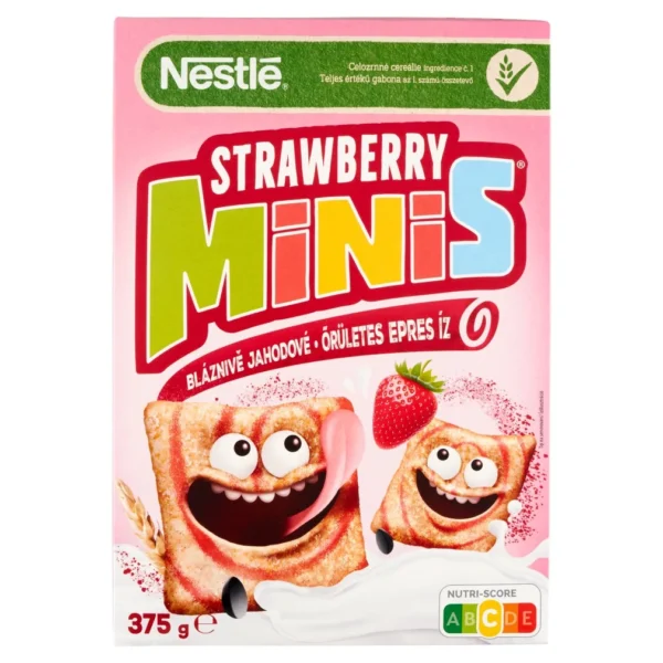 A Strawberry Minis egy ropogós, eper ízű gabonapehely, ahol az elsődleges összetevő a teljes kiőrlésű búzaliszt.